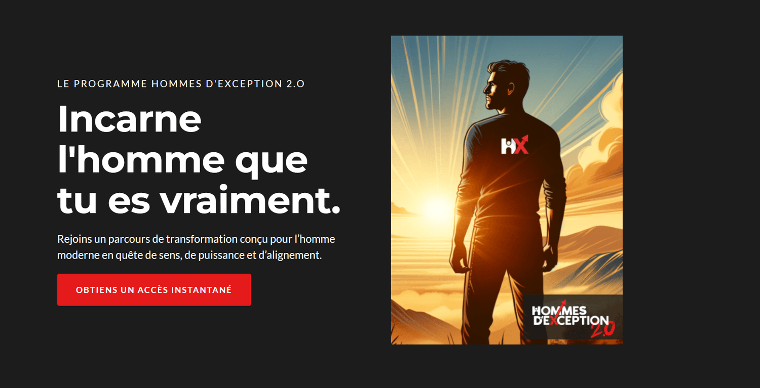 Avec Hommes d’exception, tu vas sentir ce feu intérieur renaître. Tu vas ressentir la fierté de marcher dans tes pas, avec confiance, sans plus avoir besoin de te cacher derrière des masques. C’est plus qu’un coaching. C’est une transformation émotionnelle qui te reconnecte à ta puissance tranquille et à ta liberté d’être pleinement toi.