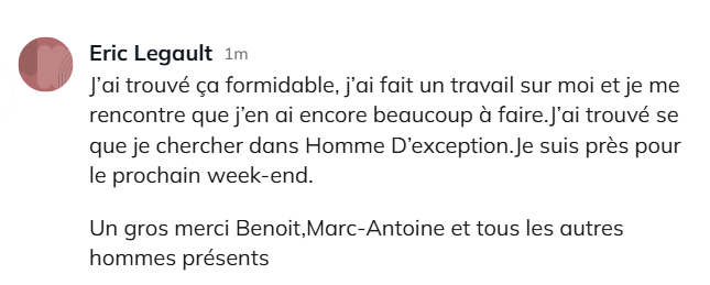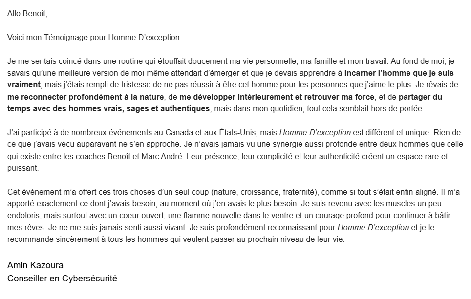 J’éprouve une gratitude infinie envers Benoit & Marc-Antoine pour avoir mis cette opportunité de croissance personnelle sur ma route. Je recommande à tout homme qui veut grandir et devenir une version améliorée et mature de lui-même de vivre au moins une fois dans sa vie l’expérience « Hommes d’exception ». C’est un des plus beaux cadeaux à s’offrir. Merci Benoit