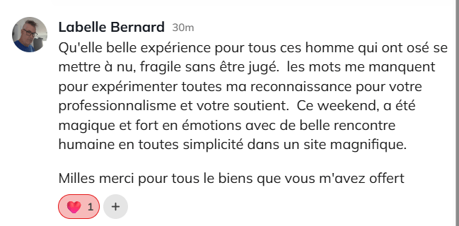 “N’hésites pas à investir en toi. Si tu es là, c’est que tu en as besoin. Ne t’abandonnes pas. Le temps d’un week-end tu ressentiras la force d’une fraternité forte unis par la confiance et la vulnérabilité.” - Patrice